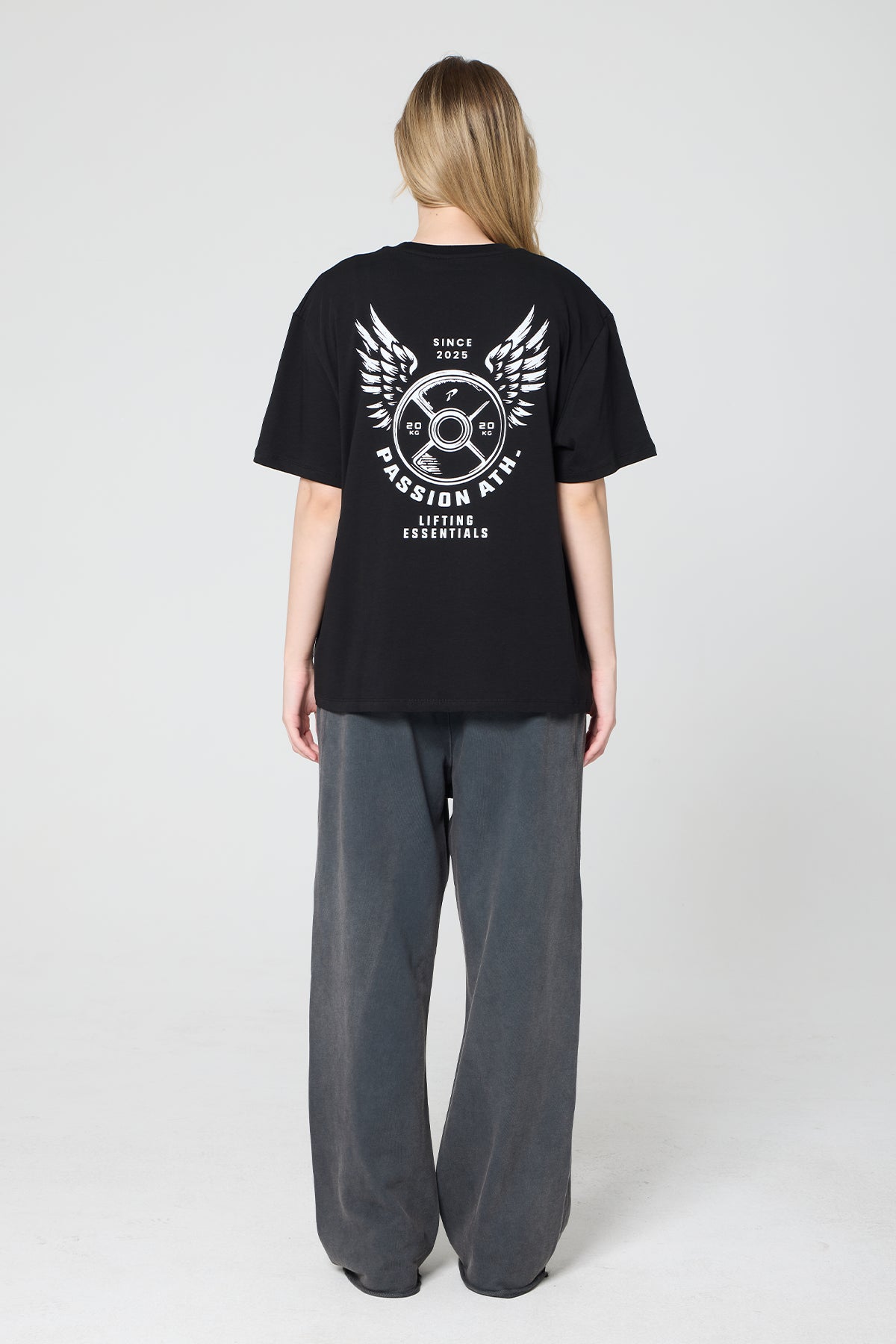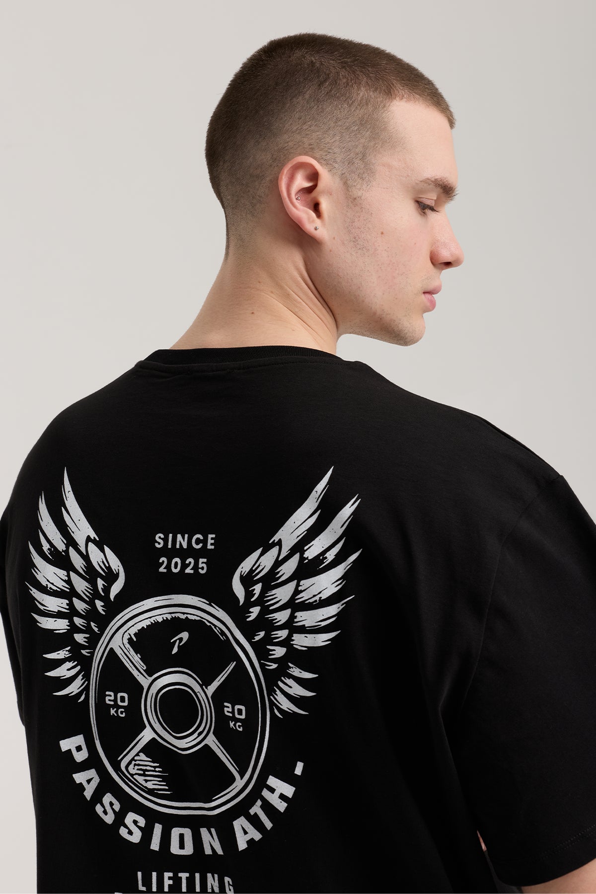 Passion Iron Heritage T-shirt, kanatlı disk ağırlık arka baskısıyla, salon ruhunu sokak stiline taşıyan oversize kesim, %100 pamuk siyah tişört.