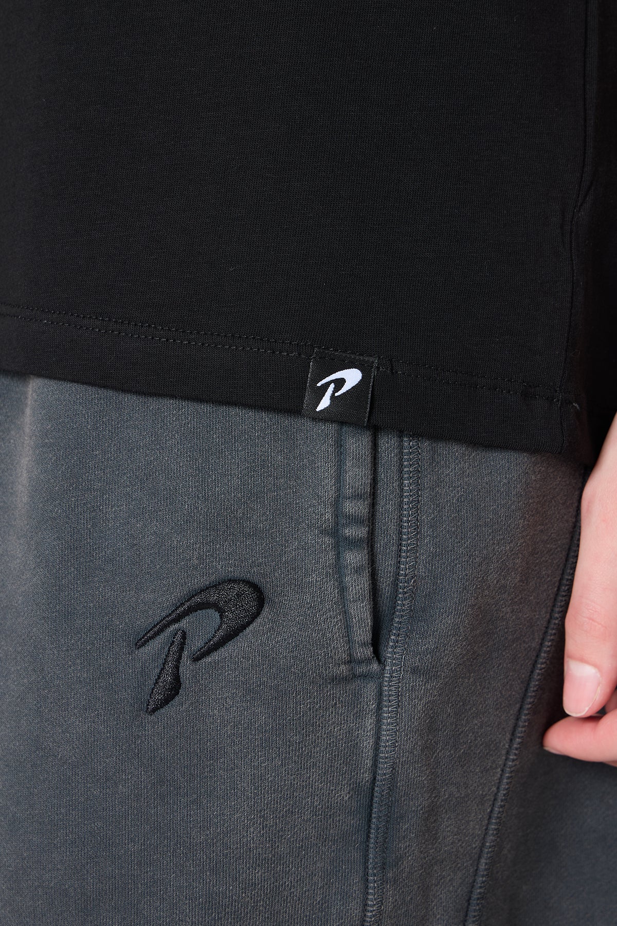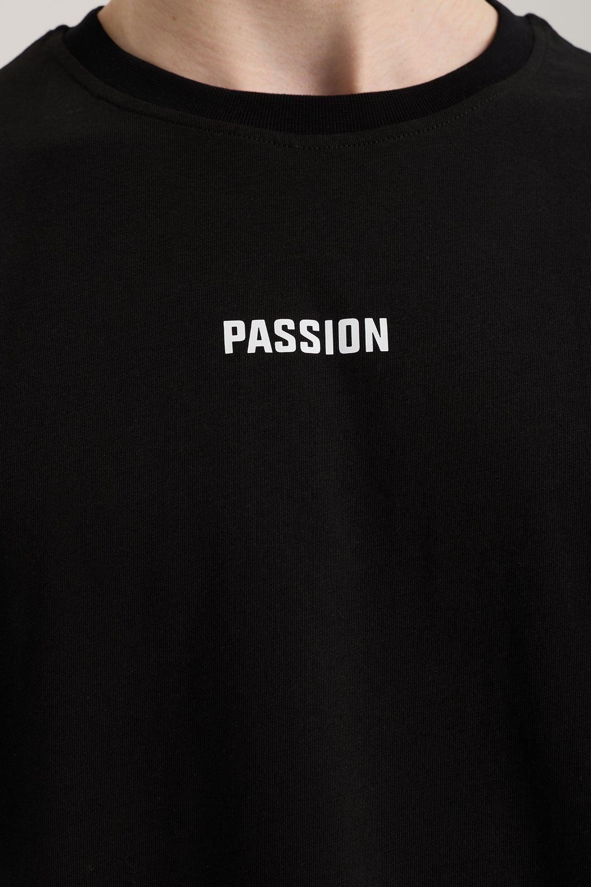Minimal logo: Göğüste küçük PASSION yazı baskısı