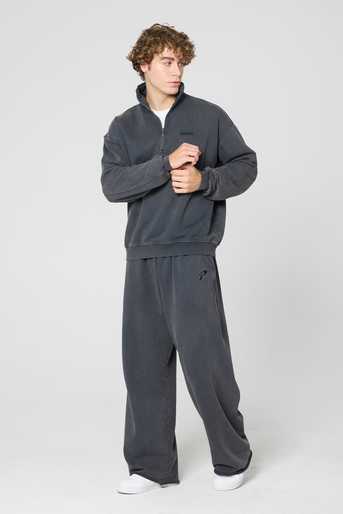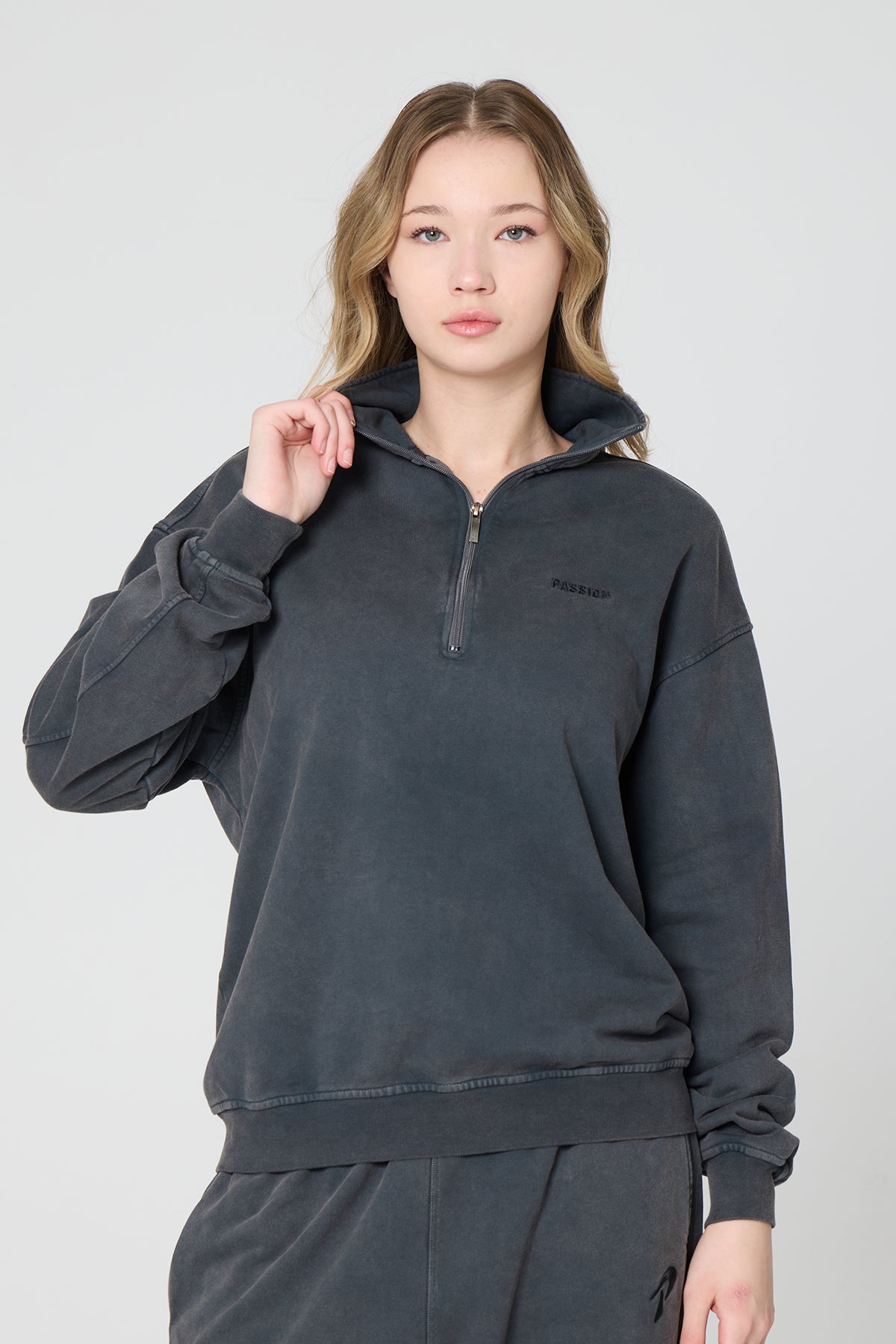 Passion Nakış Half Zip Washed Sweatshirt, washed füme tonuyla vintage bir görünüm sunarken, yarım fermuarlı yüksek yaka detayıyla modernleşir. %100 pamuk dokusu sayesinde yumuşak, nefes alabilen ve gün boyu konforlu bir katmandır. Spor sonrası ısınma, şehir içi stil veya günlük kombinler için ideal.