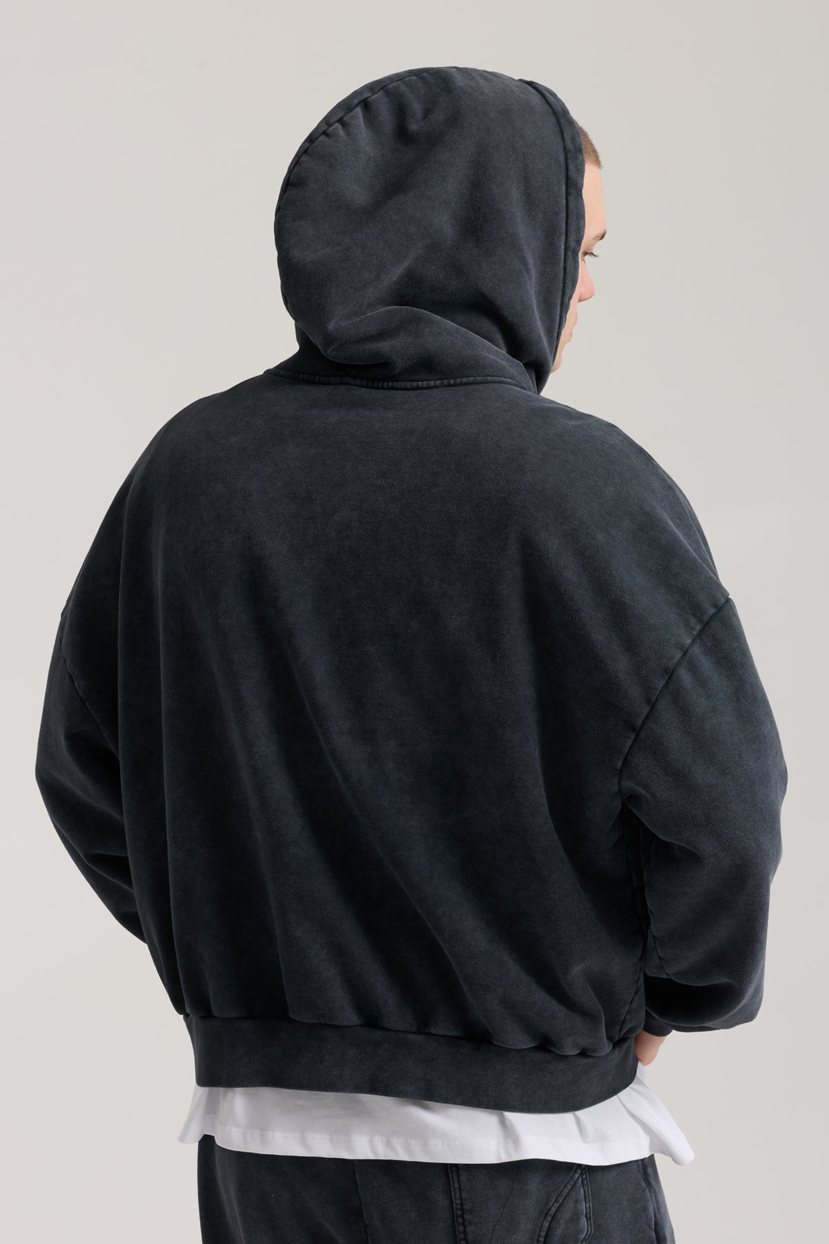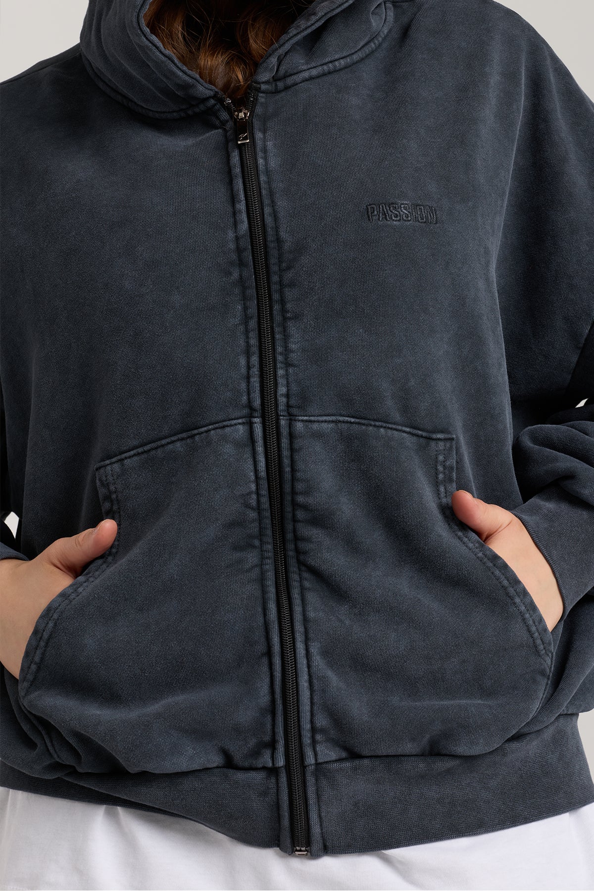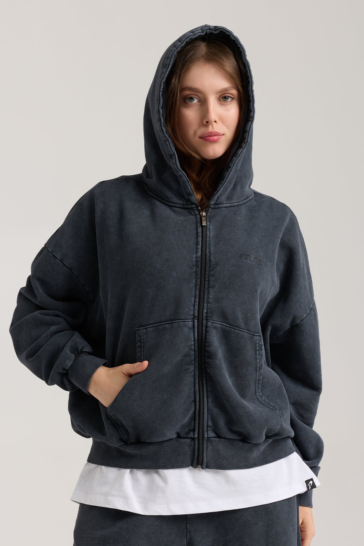 Passion Wave Washed Full Zip Hoodie, washed dokusu ve minimal PASSION nakışıyla öne çıkan bu hoodie, gün boyu konfor ve karakterli bir stil sunar. Ön göğüsteki aynı ton minimal nakış, oversize kalıp ve yumuşak pamuk kumaşla birleşerek hem spor sonrası hem de günlük şehir stilinde vazgeçilmez bir parça olur.